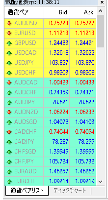 例えば、EURUSDを見ると、左右ともに、1.11213と表示されています。これはつまり、取引の際に、スプレッドとして、払うコストが0ということです。